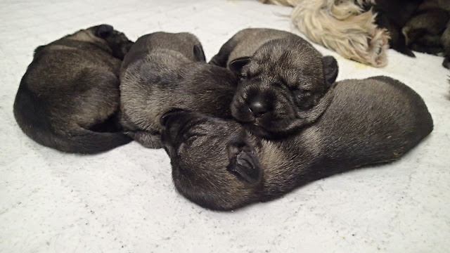Pennut saavuttivat tänään viikon iän ja laatikossa on edelleen rauhallista kuten koko härdellissä. Pennut ovat täydellisiä pikkuihmeitä ja tulipahan ne nimettyäkin jo: pojat ovat Joviaali, Juolevi, Jässikkä, Jeeveli, Jääräpää ja Juupeli, tytöistä tuli Johtotähti, Jättipotti, Juhlatuuli ja Jumprahuiti. Aika näyttää, kuka minkäkin nimiseltä näyttää tai visio on kyllä jo takaraivossa. Tunnistamista helpottavia pantoja käytän vasta, kun ovat kunnolla jaloillaan (emän kanssa tunnistamme ne jo nyt!). Eivät vielä vastustelleet pedikyyriä ja niin tuli näppärästi napsittua yhteensä 270 kynttä liukuhihnatahdilla - kymmeneltä laatikossa ja viideltä pihalla, terassilla nääs tarkeni jo! Tänään juhlistan päivää viinerikahveilla ja tässäpä kuvakimaraa muutamalta päivältä. Kovin ovat edelleen ilmeettömiä, mutta aloittanevat loppuviikosta kurkistelemisen ja kunhan vähän näkökyky ehtii kehittymään, niin siitä se vauhti lähtee kiihtymään päin (haju- ja tuntoaisti koiranpennulla on syntymästä asti, muut aistit tulevat perässä). Tämä(kin) napakka kymmenikkö on hinannut itsensä alusta asti uskomattomalla nopeudella maitobaariin, välillä loikaten!