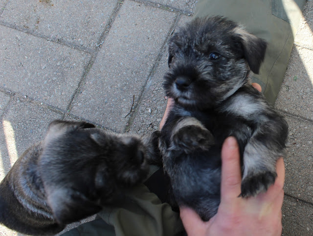 Olen supsatellut niille herätyskellon merkityksestä, mutta piupaut ne supsatteluistani välittävät ja pitävät tiukasti kiinni omasta rutiinistaan. Päivä alkaa varhain ulkoilutuokiolla, jatkuu ruokailulla, jonka jälkeen tarpeilevat uudestaan ulkoillen ja sitten alkaa rytinä sisätiloissa. Hyvin hektinen hetki, jonka jälkeen hävyttömästi käyvät uudestaan nukkumaan ennenkuin kunnolla olen omat silmäni auki saanut. Oma päiväni jatkuu isommista huolehtien ja useimmiten töitä puolituisesti jatkaen, ehkä vähän tupaakin raikaten ja vähän väliä isojen koirien kanssa pentuja palluutellen. Niin. Eipä tuo pentujen rytmi juurikaan eroa meidän normaalista arjestamme, mutta voisivat vartoa herätyskelloa. Ruokahomma jatkuu samanmoisena neljä kertaa päivässä ja joka heräämisen jälkeen kadehdin noitten uskomatonta intoa uusiin seikkailuihin. Hyvin paljon ne nukkuvat ja nukkuessaan samalla uusia taitojaan terästyttävät, sillä hereilläollessa painavat täysillä vanhaa kerraten yhä taitavammin ja uutta oppien koko ajan. Ne nauttivat hellittelyistä, veden läträämisestä räystästipan alla, tavaroitten maistelusta (serlarullan olivat purkaneet ja iloitsivat selkeesti saavutuksestaan), isompien huomiosta ja etenkin siivoamisesta - kaikkeen touhuun menevät hännät huiskaen. Keskiviikkoiltana on pentujen eläinlääkärin tarkastus, jotta jokaiselle kohtuutuore raportti matkalaukkuun pakataan. Lauantaina laitellaankin ensimmäiset maailmaa valloittamaan ja ylpeitä näistä aidoista, reippaista sekä avoimista snautserinaluista ollaan! Aiempina päivinä otetuin ulkoilukuvin tulee kuvasarjaa, sillä sisäkuvissa ollaan aivan liian likellä linssiä (jälleen tuhrittuna) ja nyt sataa vettä, voi sen koleus....
