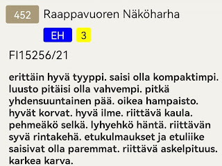 Raappavuoren Mieliharmi: Saisi olla ovaalinmuotoisemmat silmät. Korvien kiinnitys on hieman matala, joka tekee ilmeestä surullisen. Saisi olla enemmän pippuria karvassa. Liikkuu voimattomasti. AVO EH AVK2